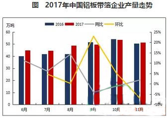 據(jù)我的有色網(wǎng)對全國40家鋁板帶箔企業(yè)調(diào)研數(shù)據(jù)顯示,2017年11月中國鋁板帶箔企業(yè)產(chǎn)量為51.35萬噸,較10月份減少了6.91%,較去年同期相比增加1.83%。1-11月份共生產(chǎn)532.5萬噸,較去年同期相比增加了5.43%。11月鋁板帶箔企業(yè)開工率為71.05%,環(huán)比下降1.35個(gè)百分點(diǎn)。其中,該40家樣本企業(yè)共計(jì)產(chǎn)能872.2萬噸,占全國總產(chǎn)能的71.55%。